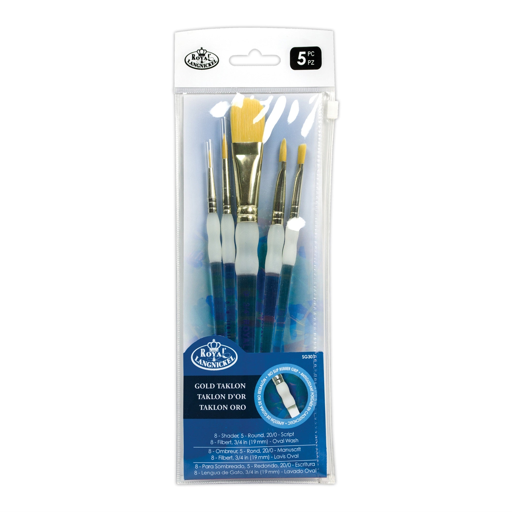 Rysg301, Soft Grip Starter 5/Pk Set. Manufactured By Royal Brush. Soft-Grip Brushes Feature Thick Acrylic Handles And Soft, No-Slip Rubber Grips Mounted In Solvent Resistant And Stable Nickel-Plated Brass Ferrules. Ideal For Watercolor, Acrylic Or Oil, This Brush Is Your Go-To For Various Arts And Crafts Projects. These Brushes Are Designed For Extended Periods Of Fatigue-Free Painting. Set Includes Shader 8, Script 20/0, Filbert 8, Round 5, Oval Wash 3/4.