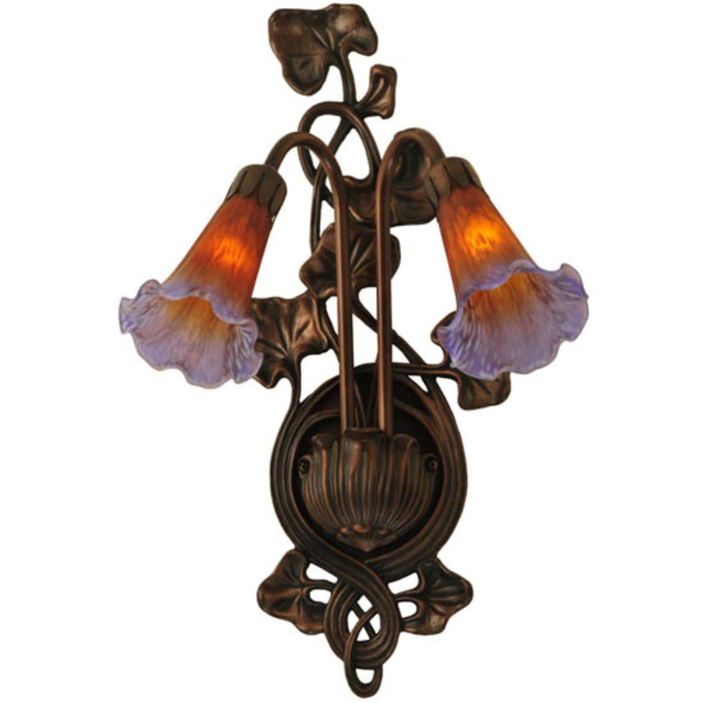 16637 11'W Amber/Purple Pond Lily 2 Lt Wall Sconce Manufacturer By Meyda. One Of The Most Popular Louis Comfort Tiffany Styled Lamps On The Market Today; Recreating His Famous Favrile Design From The Early 1900'S. This Mottled Amethyst Tipped Amber Shaded Two Light Wall Sconce Offers An Attractive; Delicate Design Featuring Shades Mouth Blown Of Fine Art Glass. Lily Shades Are Suspended From Stems Delicately Winding Above A Lily Pads Fixture Finished By Hand In Mahogany Bronze. Lens Color : Amber Glass (Not Mica);Violet, Made In China