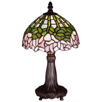 30312 13' High Tiffany Cabbage Rose Mini Lamp Manufacturer By Meyda. A Wreath Of Full Blooming Passion Pink Cabbage Roses Circle This Beautiful Stained Glass Shade In A Design Inspired By The Louis Comfort Tiffany Studio. Bronzed Green Leaves And Stems Form A Pattern Against An Opal Sky In This Lovely Mahogany Bronze Finished Mini Lamp. Lens Color : Pink;Mauve;Green;Blue;Chocolate, Made In China