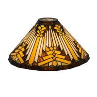 18837 13' Wide Nuevo Mission Shade Manufacturer By Meyda. Like Gazing Out Your Window Across The Warm Desert At Sunset; Interlocking Tiles Of Sand Tone Beige Glows Behind The Sun Glistened Orange; Amber Green And Brown Rays. All This Is Surrounded By A Root Brown Border. The Stunning Shade Is Created Using The Famous Meyda Tiffany Copperfoil Construction Method. The Shade Can Be Paired With A Base To Create A Stunning Table/Floor Lamp Or With Hardware To Build A Beautiful Ceiling Fixture. Lens Color : Amber Glass (Not Mica);Green;Beige, Made In China