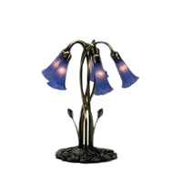 14995 16.5'H Blue Pond Lily 5 Lt Accent Lamp Manufacturer By Meyda. One Of The Most Popular Louis Comfort Tiffany Styled Lamps On The Market Today; Recreating His Famous Favrile Design From The Early 1900'S. This Softly Mottled Indigo Blue Shaded 5 Light Accent Lamp Offers An Attractive; Delicate Design Featuring Shades Mouth Blown Of Fine Art Glass. Lily Shades Are Suspended From Stems Delicately Winding Above A Lily Pad Base Finished By Hand In Mahogany Bronze. Lens Color : Blue, Made In China