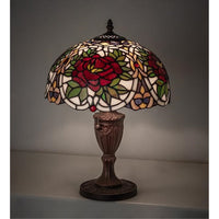 The Renaissance Rose Lamp Features An Art Glass Shade With Cabernet Red Roses Framed In Sunset Green Leaves And Ivory Scrolls On A Lavender And Plum Bronze Lace Background. This Beautiful Art Glass Shade Is Complemented With An Elegant Cast Metal Base In A Mahogany Bronze Finish. The Shade Is Accented With Red Jewels And Created Using The Famous Meyda Tiffany Copperfoil Construction Process. Ideal For Illuminating Tables And Desks In Homes; Banks; And Libraries From Boston; Massachusetts; To Des Moines; Iowa; To Seattle; Washington. The Renaissance Rose Table Lamp Is Included In Our American-Designed; Handcrafted Stained Glass Lighting Collection. Ul And Cul Listed For Dry Locations. Each Shade Is A Unique Work Of Art With Color Variations Based On Natural Ingredients Inherent In The Glass.