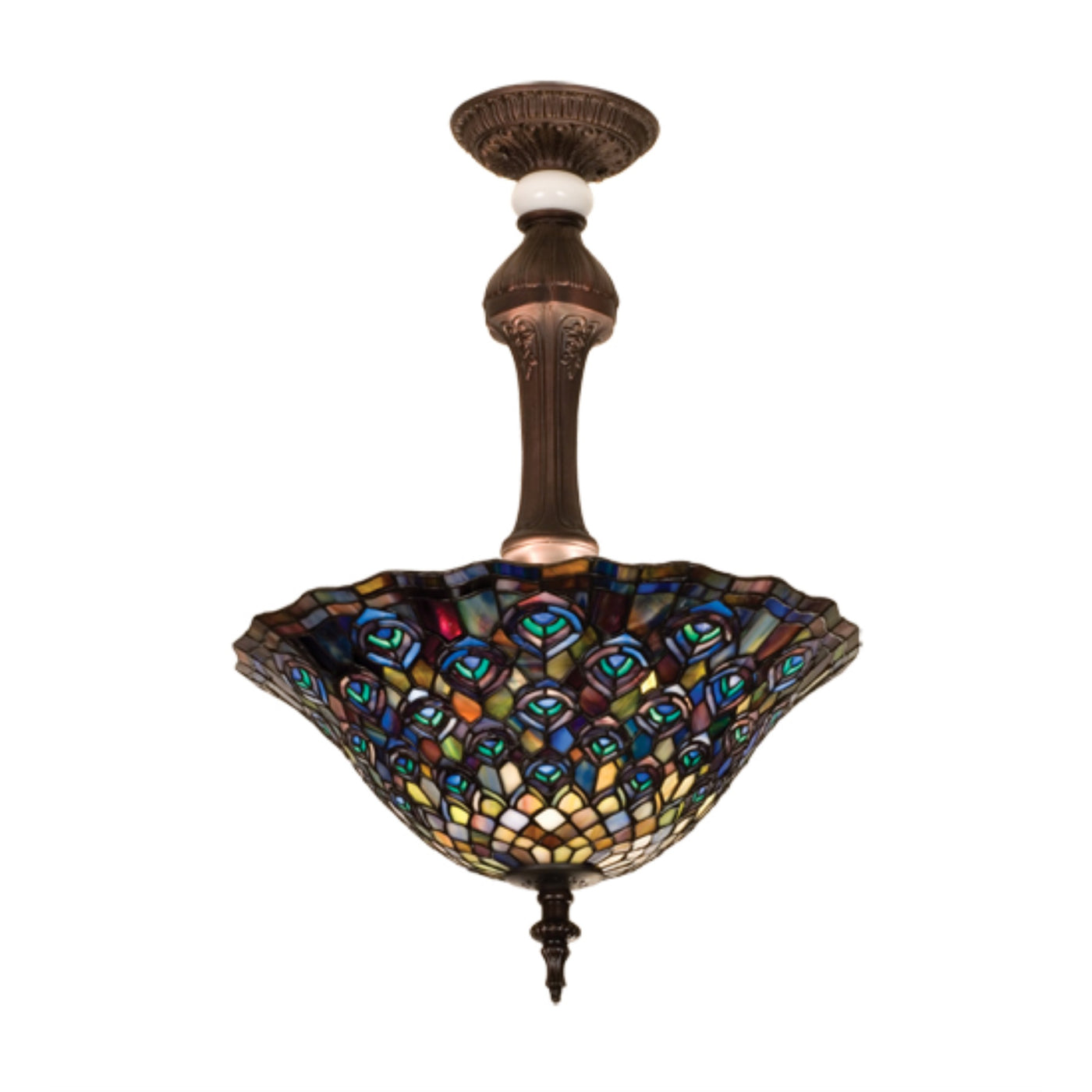31101 20'W Tiffany Peacock Feather Semi-Flushmount Manufacturer By Meyda. As Distinctive As A Beautiful Peacock'S Feathers; No Two Shades Will Ever Be The Same As Their Individuality Can Be As Remarkably Unique As Their Personality. This Artistic Creation Utilizes Swirling Opalescent Art Glass Background Combinations Including Beige Amber; Yellow Pinks; Red Purples; Golden Blues And Greens; Ivories; Bluish Whites; Turquoise Blues; Periwinkle; Olive And Spring Greens; Pale Yellow; Amethyst; Emerald And Topaz. The Eye Of The Plumage Design Reveals Purples; Pastel Blues; Teals; Cobalt And Ivories. Individual Pieces Of Glass Are Hand Cut And Wrapped Using Meyda Tiffany'S Famous Copperfoil Construction. Each Shade Is A Unique Work Of Art With Color Variations Based On Natural Ingredients Inherent In The Glass. Mahogany Bronze Finish. Lens Color : Amber Glass (Not Mica);Green;Blue;Violet, Made In China