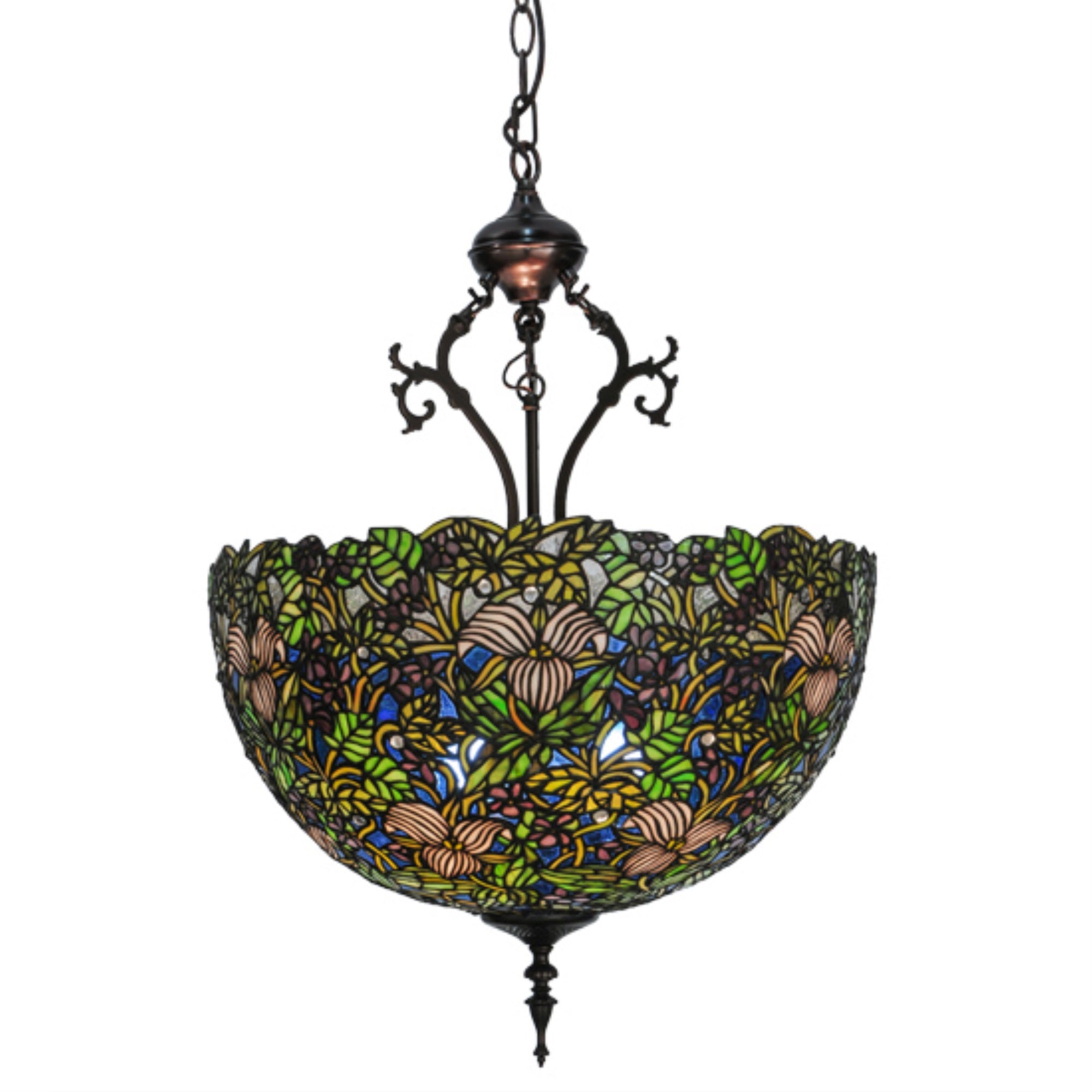 52187 20'W Trillium & Violet Inverted Pendant Manufacturer By Meyda. Nature Abounds In This Meyda Tiffany Designer Stained Glass Shade. Glistening Ruby Red Berries; Ivory Trilliums And Clusters Of Purple Violets With Woodland Green Leaves Make A Lacework Of Wildflowers Against A Cobalt Blue Forest Sky. Each Piece Of Glass In The Shade Is Hand Cut And Wrapped In Copper Foil. The Inverted Pendant Hardware Is Hand Finished In Mahogany Bronze. Lens Color : Pink;Green;Blue;Violet;White;Clear, Made In China