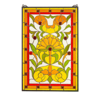 98229 20'W X 30'H Picadilly Stained Glass Window Manufacturer By Meyda. A Mango Colored Fan Flower Is Surrounded By Radiant Textured Willow Green Leaves And Topaz; Honey; Amber And Clear Accents. Glistening Amber Jewels And A Wispy Beige Background Highlight This Victorian Masterpiece. Handcrafted Utilizing The Copperfoil Construction Process And 239 Pieces Of Stained Art Glass Encased In A Solid Brass Frame. Mounting Bracket And Jack Chain Included. Lens Color : Coral;Amber Glass (Not Mica);Green;Beige;Clear, Made In China