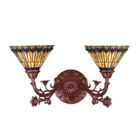 31971 21'W Tiffany Jeweled Peacock 2 Lt Wall Sconce Manufacturer By Meyda. As Distinctive As Beautiful Peacock Fanning Feathers In The Wild; No Two Shades Will Ever Be The Same As Their Individuality Can Be As Remarkably Unique As Their Personality. This Artistic Creation Utilizes Swirling Opalescent Art Glass Background Combinations Including Beige; Yellow Pinks; Golden Greens; Ivories; Bluish Whites; Turquoise Blues; Olive And Spring Greens. The Eye Of The Plumage Design Reveals Purples; Pastel Blues; Teals; Cobalt And Ivories; Accented With Blue And Purple Colored Jewels. Individual Pieces Of Glass Are Hand Cut And Wrapped Using Meyda Tiffany'S Famous Copperfoil Construction. Each Shade Is A Unique Work Of Art With Color Variations Based On Natural Ingredients Inherent In The Glass. Mahogany Bronze Finish. Lens Color : Ruby;Mauve;Green;Blue;Violet, Made In China