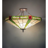 This Classic Wilkinson Stained Glass Shade Features Ruby Glass Square And Triangular Jewels That Accent Cerise Red Streaked Forrest Green Bands On A Warm Beige Background. This Handsome Shade Is Handcrafted Using The Famous Meyda Tiffany Copperfoil Construction Technique. The Stained Glass Chandelier Is Complemented By Coordinating Hand-Finished Mahogany Bronze Hardware. It Is Ideal For Illuminating Entryways And Dining Spaces In Fine Homes And Restaurants. The Wilkenson Inverted Semi-Flushmount Is Featured In Our American-Designed; Handcrafted Stained Glass Lighting Collection. Each Shade Is A Unique Work Of Art With Color Variations Based On Natural Ingredients Inherent In The Glass.