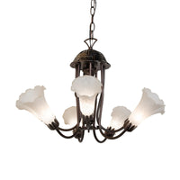 Recreating The Popular Tiffany Design From The Early 1900S... This Classic Chandelier Features 7 Stunning White Favrile-Style Art Glass Shades Complemented With An Elegant Curvaceous Cast Metal Frame Featuring A Mahogany Bronze Finish. The Overall Height Ranges From 18 To 53 Inches As The Chain Easily Adjusts In The Field. The Pond Lily Chandelier Is Included In Our American-Designed; Handcrafted Favrile Glass Lighting Collection. Ul And Cul Listed For Dry And Damp Locations. Each Shade Is A Unique Work Of Art With Color Variations Based On Natural Ingredients Inherent In The Glass. Please Feel Free To Contact Us If Color Matching Is Critical When Ordering Multiple Items.
