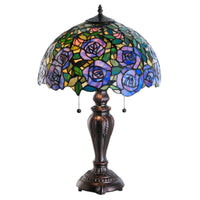 138584 24'H Rosebush Table Lamp Manufacturer By Meyda. The Most Beloved Of All Flowers; The Rose; Is Dramatically Transformed Into Unique Iconic Flowers In This Meyda Interpretation Of A Tiffany Classic. These Extraordinary Blue And Pink Passion Art Glass Roses Ramble On A Maze Of Garden And Leafy Green Leaves In Fine Foliage Fashion. The Delicate Domed Stained Glass Shade; Which Is Created With Meyda'S Famous Copperfoil Construction; Is Paired With A Graceful; Hand Finished Mahogany Bronze Table Base Featuring Two Pull Chains. Lens Color : Pink;Green;Violet;Beige, Made In China
