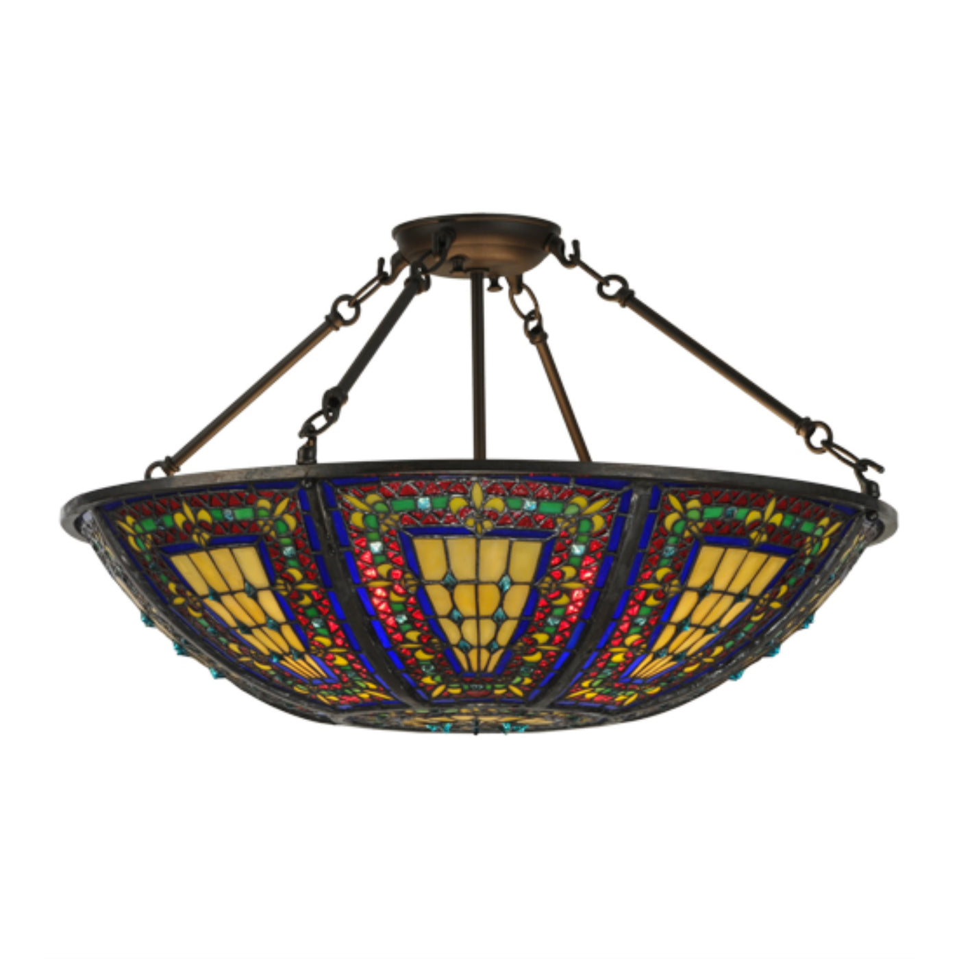 150817 24'W Fleur-De-Lis Semi-Flushmount Manufacturer By Meyda. Every Meyda Tiffany Item Is A Unique Handcrafted Work Of Art. Natural Variations In The Wide Array Of Materials That We Use To Create Each Meyda Product Make Every Item A Masterpiece Of Its Own. Photographs Are A General Representation Of The Product. Colors And Designs Will Vary. Lens Color : Ruby;Sunflower;Green;Blue, Made In China