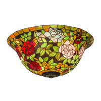 29209 24'W Tiffany Rosebush Shade Manufacturer By Meyda. The Most Beloved Of All Floral Beauties. The Rosebush Is Beautifully Represented In This Stunning Reproduction Of A Tiffany Studio Classic. Petal Pink; Romantic Red And Beautiful Blue Art Glass Roses Ramble On A Maze Of Garden Green Leaves. The Shade Is Created Using The Famous Meyda Tiffany Copperfoil Construction. The Delicate Domed Stained Glass Shade Can Be Paired With A Base To Create A Stunning Floor Lamp Or Hardware To Build A Beautiful Ceiling Fixture. Lens Color : Ruby;Green, Made In China