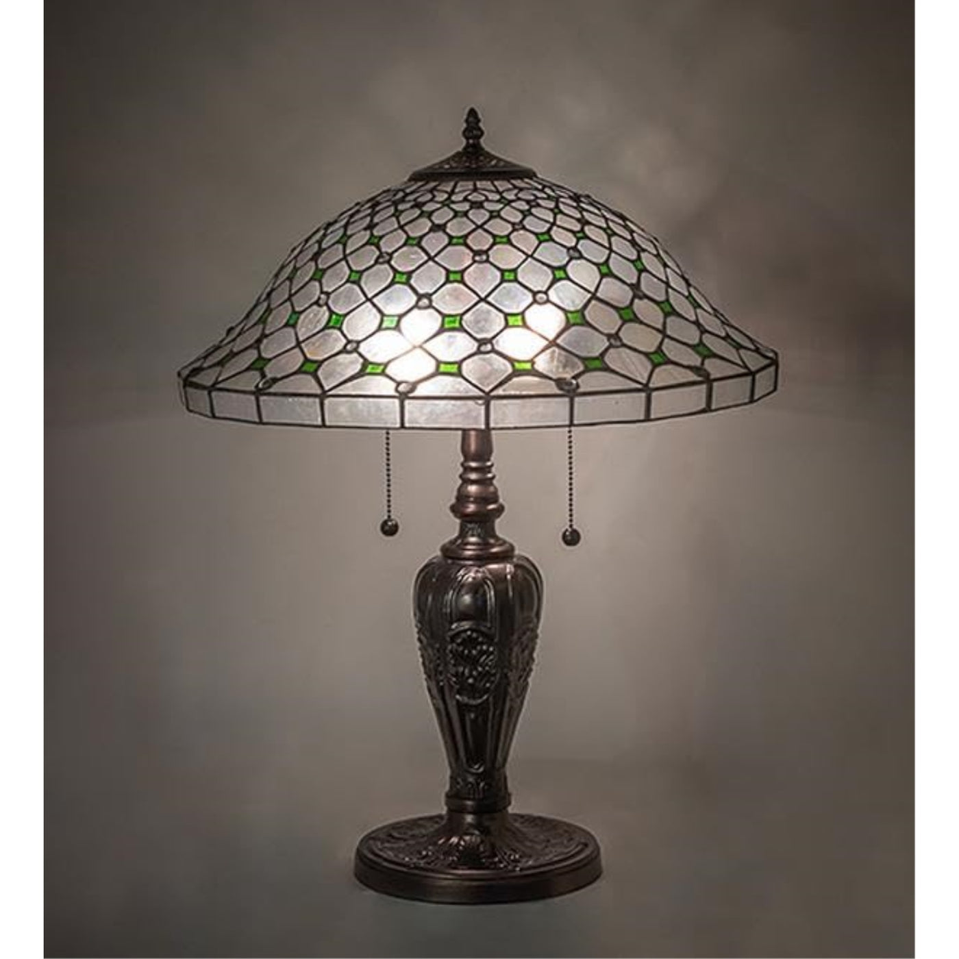 The Clear Glass Art Glass Shade Features Sparkling Emerald Diamond-Shaped Accents And Jewel Droplets In This Elegant Victorian-Style Shade. The Beautiful Table Lamp Features A Stained Glass Shade Created Using The Famous Meyda Tiffany Copperfoil Construction Technique. The Elegant Cast Metal Lamp Base Is Hand Finished In Warm Mahogany Bronze. It Is Ideal As An Illuminating Accent Piece On A Credenza; Occasional Table; And Other Spaces In Residential And Hospitality Settings. This Lighting Design Is Inspired By Diamonds In Fine Jewelry Retailers From Fifth Ave In New York City; Palm Beach Gardens In Florida; To Rodeo Drive In Beverly Hills; California. The Diamond & Jewel Table Lamp Is Included In Our American-Designed; Handcrafted Stained Glass Lighting Collection. Ul And Cul Listed For Dry Locations. Each Shade Is A Unique Work Of Art With Color Variations Based On Natural Ingredients Inherent In The Glass.