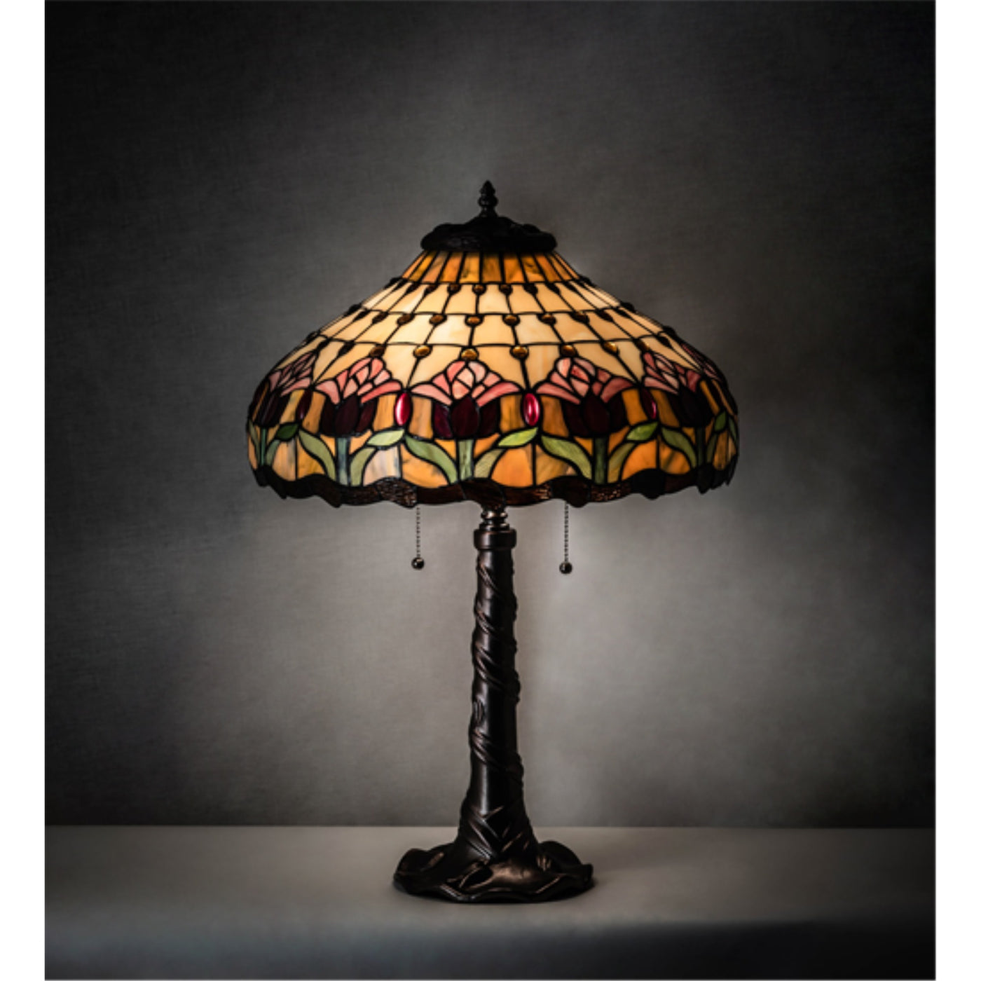 99270 26' High Colonial Tulip Table Lamp Manufacturer By Meyda. Pearlescent Beige Glass Panels With Plum Pink Colonial Tulips Setting Atop Spring Green Leaves Are Accented With Amethyst Jewels And Waves Of Mahogany Granite Glass. The Mahogany Bronze Finished Table Lamp Base Repeats The Tulip Pattern With Embossed Waves And Swirling Leaves. Lens Color : Ruby;Pink;Chocolate;Beige, Made In China