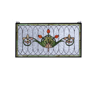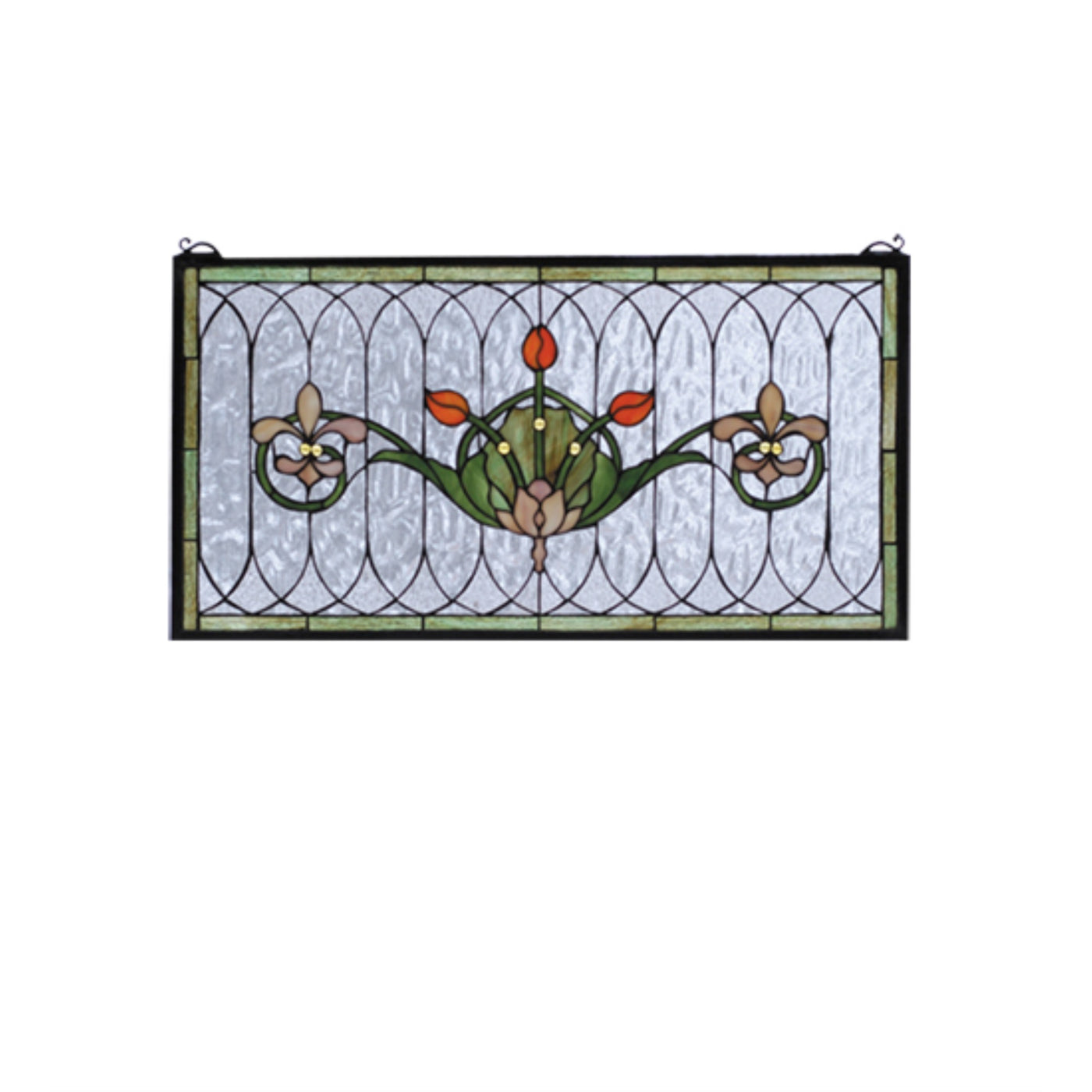 68019 26'W X 14'H Tulip & Fleurs Stained Glass Window Manufacturer By Meyda. Spring Green Leaves And Borders; Lively Coral Tulips And Plum Beige Fleur-De-Lis; Accent The Rippling Textured Clear Glass Of This Elegant Victorian Inspired Stained Glass Window. The Window Is Handcrafted Utilizing The Copperfoil Construction Process And 192 Pieces Of Stained Art Glass Encased In A Solid Brass Frame. This Lovely Window Is A Creation To Be Forever Treasured. Mounting Bracket And Chain Included. Lens Color : Mauve;Coral;Green;Clear, Made In China