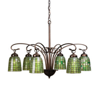 18649 28'W Terra Verde 6 Lt Chandelier Manufacturer By Meyda. Honeydew Green Glass Cascades In A Geometric Grid On Elongated Hand Crafted Shades Which Are Suspended From The Gracefully Curved Arms Of This Six Light Chandeliers Finished In Mahogany Bronze. Lens Color : Green, Made In China