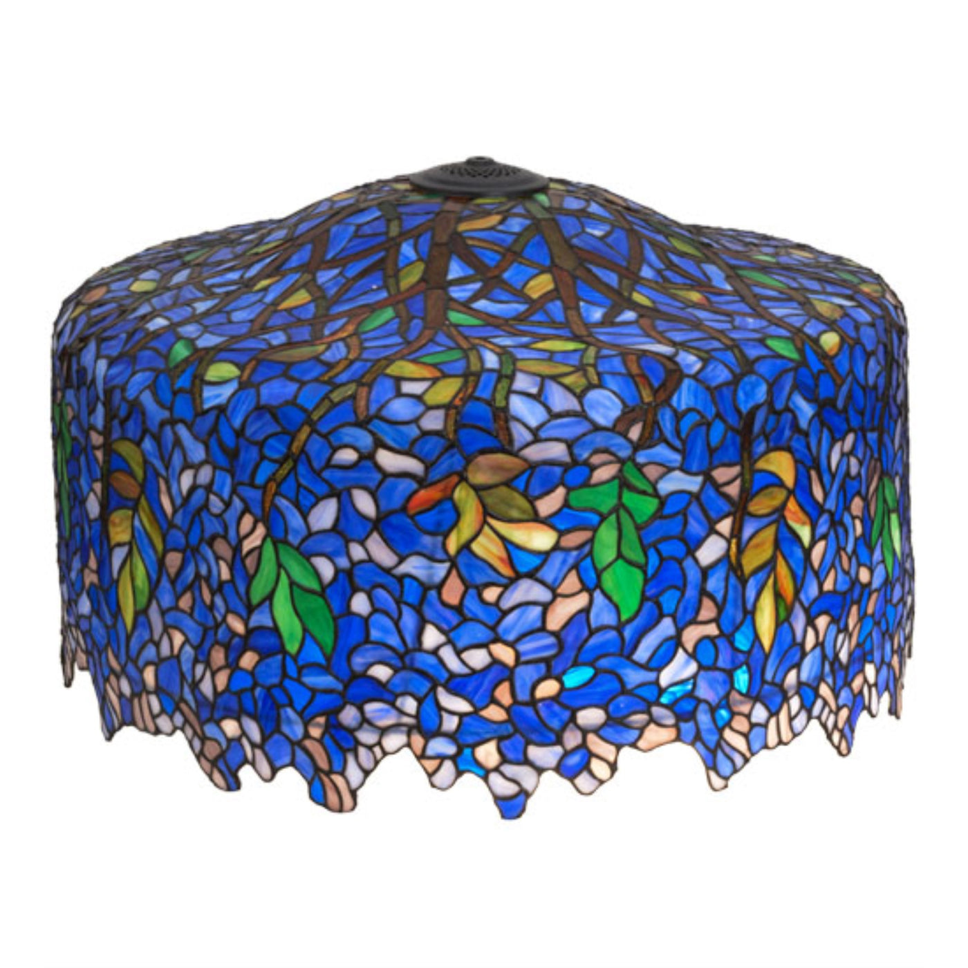 21934 30'W Tiffany Wisteria Shade China. The Wisteria Was Popular Floral Design Created By Louis Comfort Tiffany; More Than A Century Ago. Decorative Stained Glass Lampshade; With Undulating Edges Depict Clusters Of Plum And Periwinkle Petals Amid Spring Green And Autumn Harvest Leaves.