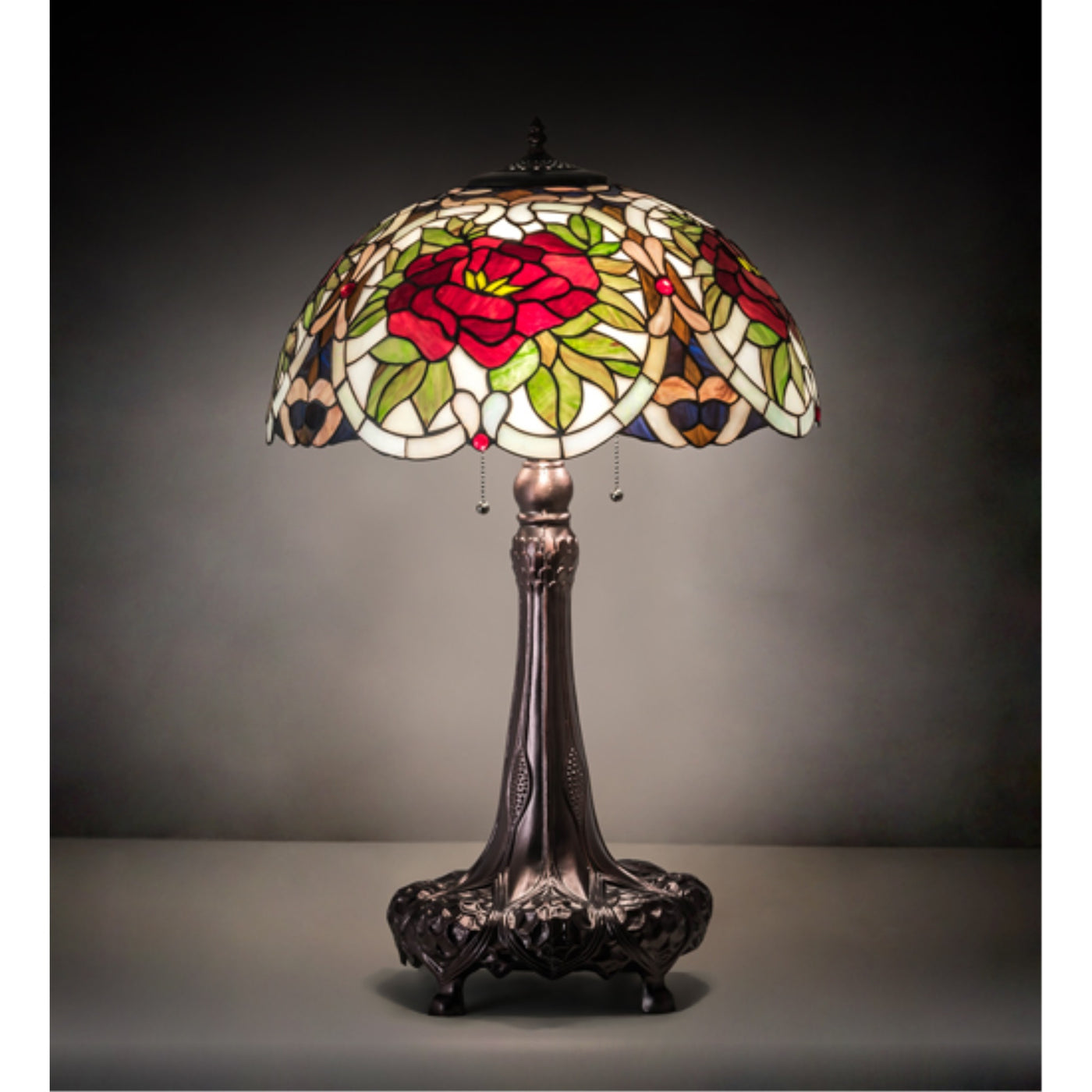 230476 31' High Renaissance Rose Table Lamp Manufacturer By Meyda. The Renaissance Rose Lamp Features An Art Glass Shade With Cabernet Red Roses Framed In Sunset Green Leaves And Ivory Scrolls; On A Lavender And Plum Bronze Lace Background. This Beautiful Art Glass Shade Is Complemented With A Table Lamp Base In A Mahogany Bronze Finish. The Shade Is Accented With Red Jewels And Created Using The Famous Meyda Tiffany Copperfoil Construction Process. Ul And Cul Listed For Dry Locations. Each Shade Is A Unique Work Of Art With Color Variations Based On Natural Ingredients Inherent In The Glass. Contact Us If Color Matching Is Critical When Ordering Multiple Items. Lens Color : Ruby;Pink;Green, Made In China