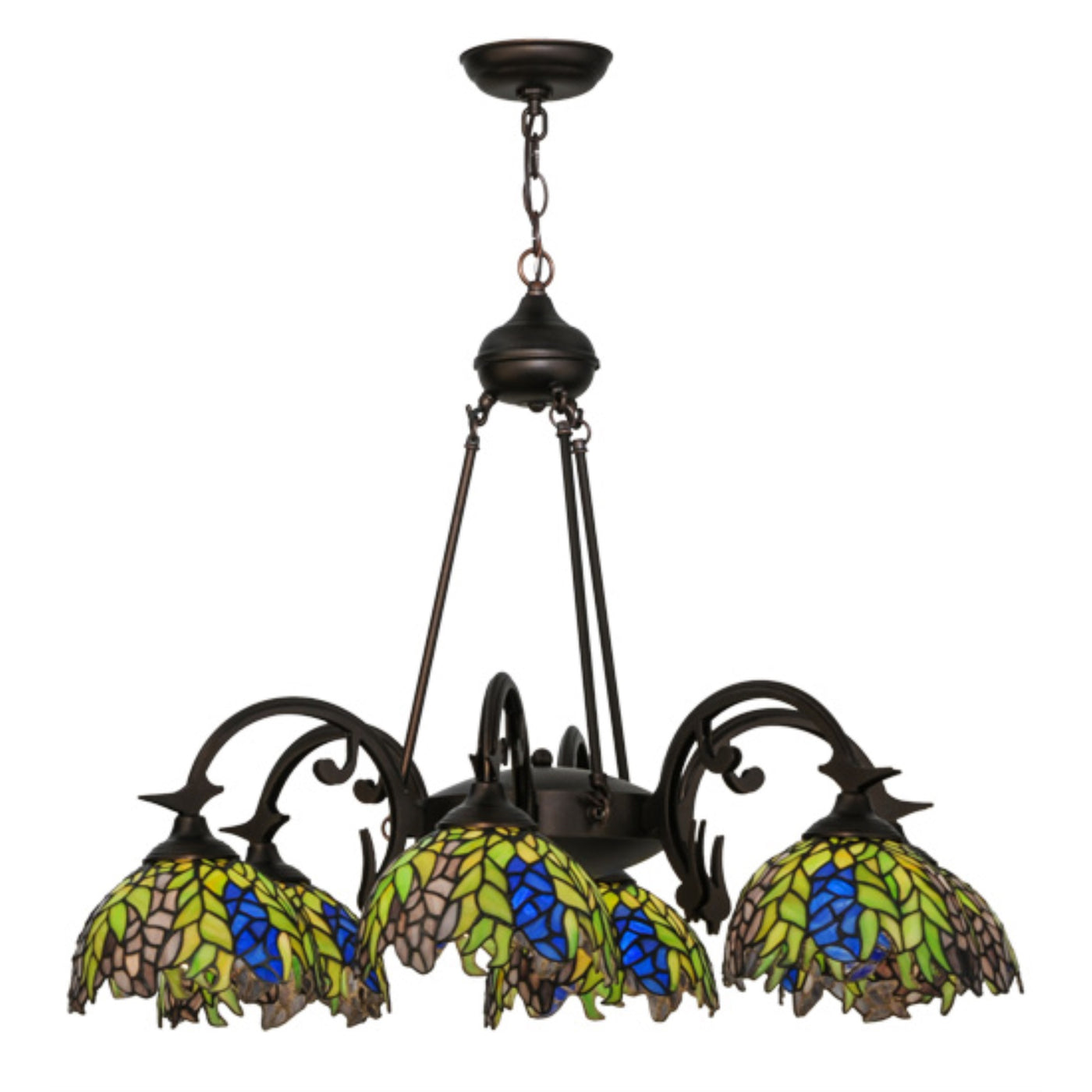 27397 32'W Tiffany Honey Locust 6 Lt Chandelier Manufacturer By Meyda. The Honey Locust Was Popular Floral Design Created By Louis Comfort Tiffany; More Than A Century Ago. Decorative Dome-Shaped Stained Glass Lampshades; With Petal Shaped Edges Depict Clusters Of Plum And Periwinkle Flowers Amid Spring Green Leaves Cascading Towards The Base. This Six Light Chandelier Has Complementary Decorative Hardware Featuring Our Mahogany Bronze Finish. Lens Color : Green;Blue;Violet, Made In Usa
