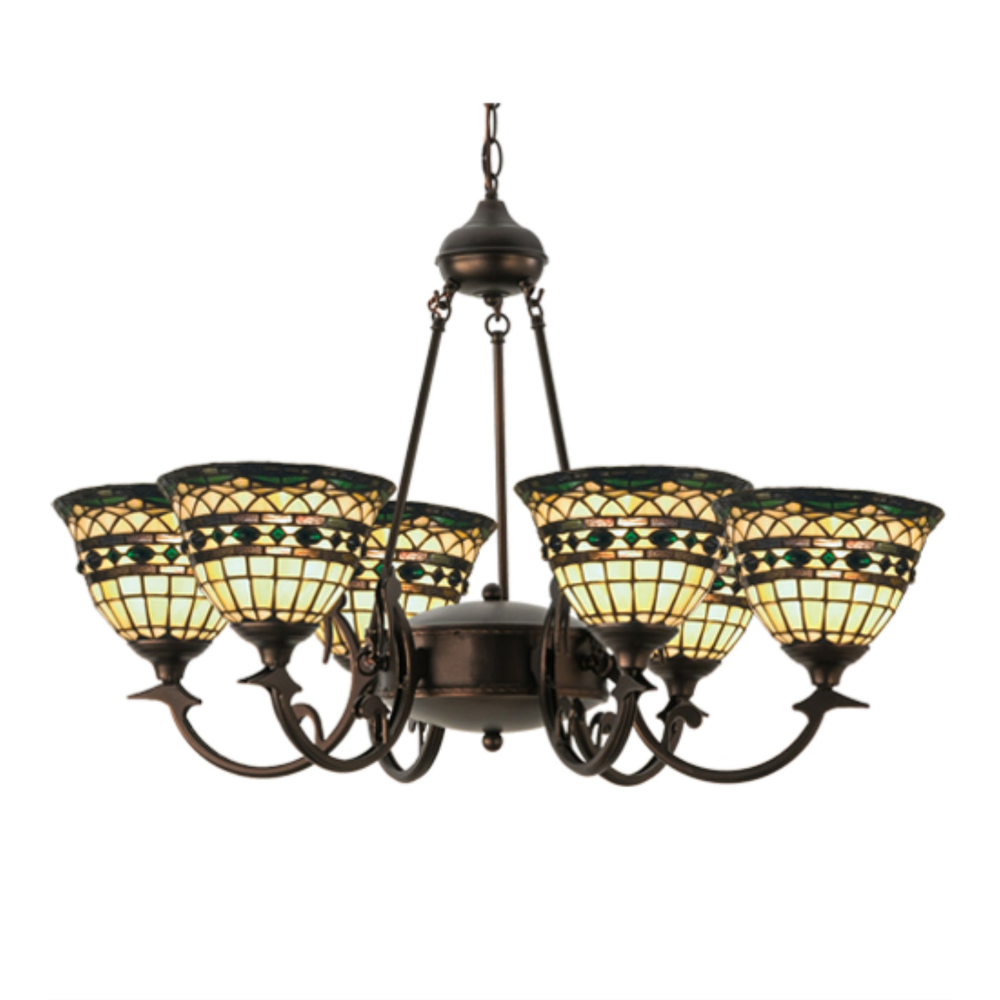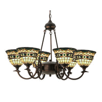 27402 32'W Tiffany Roman 6 Lt Chandelier.602 Manufacturer By Meyda. Emerald-Colored Jewels And Multi Colored Granite Glass; Accent The Handsome Amber Beige Art Glass Reproduction Of A Famous Louis Comforttiffany Design. This Tiffany Roman Shade Is Inspired By Italian Art And Architecture And Is Handcrafted Of Authentic Stained Glass By Meyda Tiffany Artisans Using A Copperfoil Construction Method. The Six Light Chandelier Hardware Is Finished In A Hand Applied Mahogany Bronze. Lens Color : Green;Blue;Violet, Made In Usa