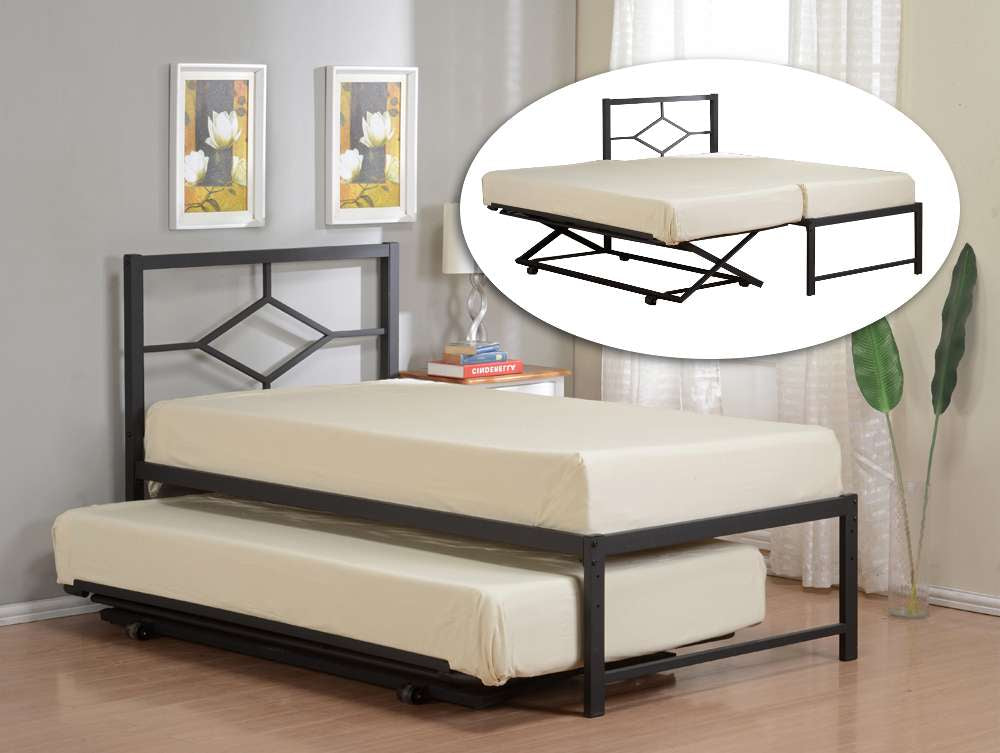 Black Metal Twin Size Day Bed (Daybed) With Metal Slats &Amp; Designed Headboard With Pop Up Trundle Bed. This Pilaster Designs Bed And Pop Up Trundle, Will Finally Do The Trick, Of Allowing You To Have Enough Beds, Without Taking Space Away. The Trundle Fits Neatly Underneath The Day Bed, And Comes Out Easily When Night Falls, And You Just Want To Fall Into A Comfortable Bed. The Beautifully Decorated Headboard On The Day Bed, Will Add Just The Right Simple And Classic Touch To Your Children'S Room Or Guest Room.