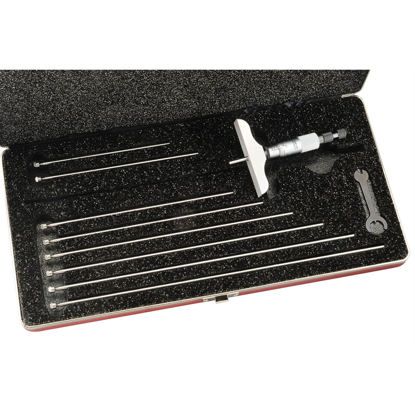 The Starrett 440, 440M, 445, 445M Series Depth Micrometer Features A Combination Ratchet And Speeder, Ring-Type Locknut, Ratchet Stop And Locknut. 0-9 Range, 3 Base, 9 Rods, Ratchet Stop, Lock Nut, Case.