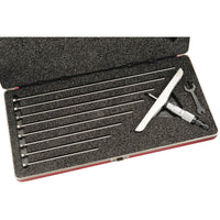 The Starrett 440, 440M, 445, 445M Series Depth Micrometer Features A Combination Ratchet And Speeder, Ring-Type Locknut, Ratchet Stop And Locknut. 0-9 Range, 6 Base, 9 Rods, Ratchet Stop, Lock Nut, Case.