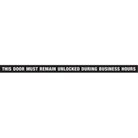 Hillman 840205 This Door Must Remain Unlocked During Business Hours Flexible Self Adhesive Sign, Black And White Vinyl, 1.5X28 Inches 1-Sign This Door Must Remain Unlocked During Business Hours Sign Designates A Door To Remain Unlocked During Business Hours. The Bold Text Is Easily Legible, And Sends The Message Across Clearly. The Sign Has This Door Must Remain Unlocked During Business Hours Text In Bold White, Against A Reflective Black Background. It Should Be Placed Horizontally On The Door, Or A Location Near The Door Where It Is Clearly Visible. It Is Made Using Heat Resistant Vinyl, A Type Of Material Designed For Extreme Temperatures. Vinyl Is An Extremely Durable Material That Is Flexible And Resistant To Impact, Weather, And Tear. It Can Withstand Most Environments, And Will Not Fade In High Temperatures. The Ultra-Violet Fluorescent Ink Used Ensures Maximum Visibility From Different Viewing Angles. Installation: The Self-Adhesive Pressure Sensitive Backing Firmly Attaches Instantly To Most Smooth And Flat Surfaces Without Requiring Any Tools. To Install, Ensure The Surface Where The Sign Is Being Installed Is Clean And Dry. Peel Off The Back Cover To Reveal The Self-Adhesive Backing. Press And Hold The Adhesive Side Firmly Against The Surface Being Installed On For A Few Seconds. Suitable For Commercial And Residential Use. About The Hillman Group: The Hillman Group Is A Renowned Brand Leader For Home Hardware And Home Improvement Products. It Was Started In 1964 As A Fastener Company, Growing To Well Over 130,000 Sku'S Since. Hillman Focuses On Providing Quality, Service And Innovation. Made In Usa. This Item Is Sold Individually As A Single Pack, 1-Sign. This Door Must Remain Unlocked During Business Hours Sign Designates A Door To Remain Unlocked During Business Hours. The Sign Has This Door Must Remain Unlocked During Business Hours Text In Bold White, Against A Reflective Black Background. , Sign Made Of Ultra-Violet Fluorescent Ink For Maximum Visibility From A Distance. Measures 1.5 X 28 Inches. , Made From Heat Resistant Vinyl, A Type Of Material Designed For Extreme Temperatures. Vinyl Is Extremely Flexible, Durable And Impact Resistant. Withstands Most Environments, And Will Not Fade In Extreme Temperatures. , Self-Adhesive Backing For Easy Installation. Sticks Effortlessly To Most Smooth, Flat Surfaces. , Made In Usa. This Item Is Sold Individually As A Single Pack, 1-Sign.