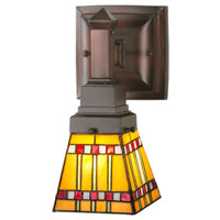 24275 5'W Prairie Corn Wall Sconce Manufacturer By Meyda. With Their Love Of Geometric Forms; Architects Of The Prairie School Interpret Organic Objects Into Simplified Lines. The Meyda Tiffany Prairie Corn Wall Sconce Shade Has Rows Of Chili Red And Wheat Kernels And Stalks Of Bronzed Jade Against A Maize Gold Background. The Stained Glass Shade Is Paired With Simple Mission Style Hardware In A Mahogany Bronze Finish. Lens Color : Ruby;Coral;Sunflower;Amber Glass (Not Mica);Green;Chocolate;Beige;White, Made In China