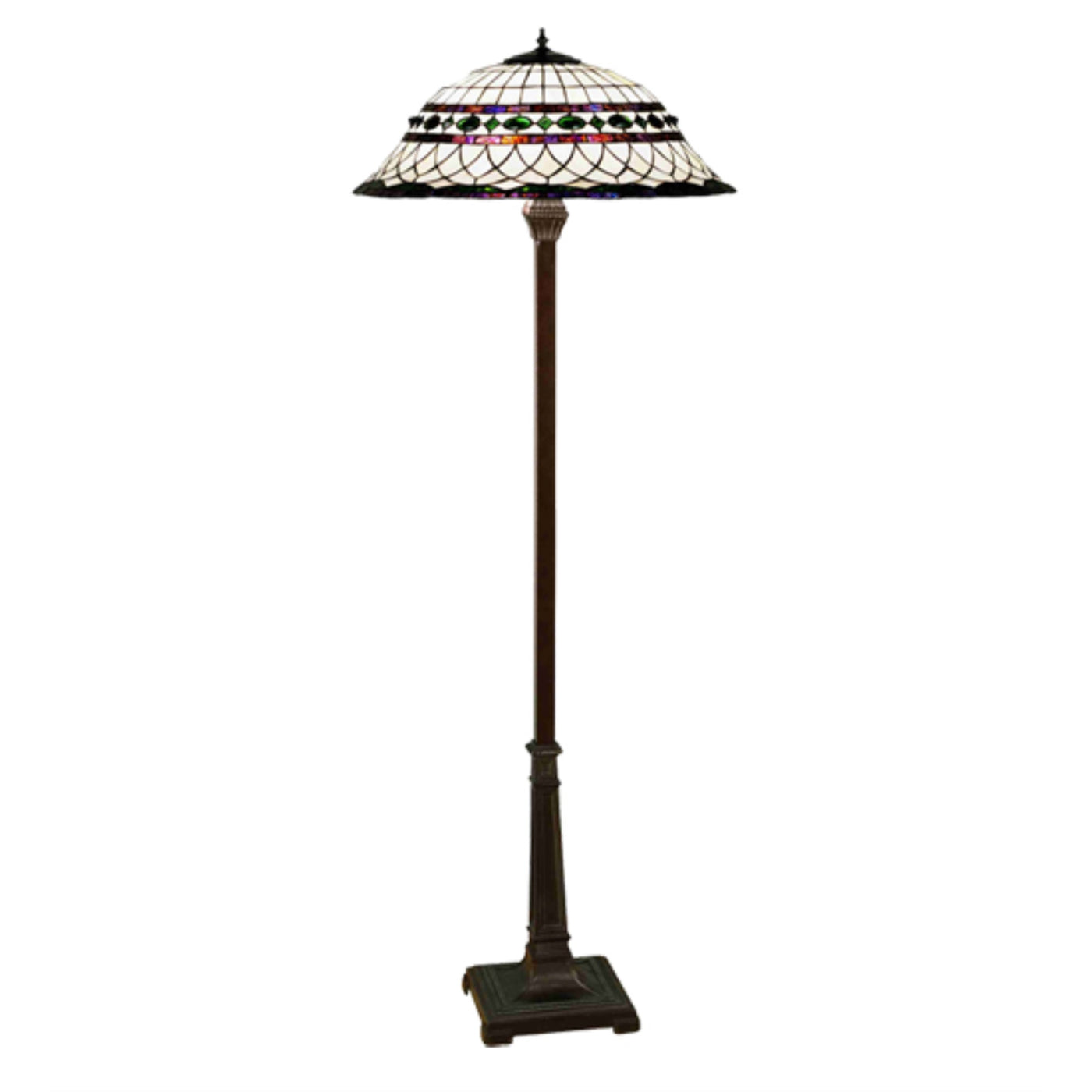 30369 65'H Tiffany Roman Floor Lamp Manufacturer By Meyda. Emerald-Colored Jewels And Multi Colored Granite Glass; Accent The Handsome Amber Beige Art Glass Reproduction Of A Famous Louis Comforttiffany Design. This Tiffany Roman Shade Is Inspired By Italian Art And Architecture And Is Handcrafted Of Authentic Stained Glass By Meyda Tiffany Artisans Using A Copperfoil Construction Method. The Floor Lamp Base Is Finished In A Hand Applied Mahogany Bronze. Lens Color : Mauve;Green;Beige, Made In China