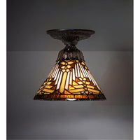 Like Gazing Out Your Window Across The Warm Desert At Sunset; Interlocking Tiles Of Sand Tone Beige Glow Behind The Sun; Glistening Orange; Amber Green; And Brown Rays. A Root Brown Border Surrounds All This. The Stunning Nuevo Mission Ceiling Fixture Features A Stained Glass Shade Created Using The Famous Meyda Tiffany Copperfoil Construction Method And Embraced With Mahogany Bronze Finished Hardware. The Nuevo Mission Flushmount Is Featured In Our American-Designed; Handmade Southwestern Stained Glass Series. The Fixture Is Ul And Cul Listed For Dry And Damp Locations. Each Shade Is A Unique Work Of Art With Color Variations Based On Natural Ingredients Inherent In The Glass.