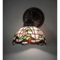 Grace Your Home With This Elegant Shade Featuring A Gridwork Of White Art Glass Adorned With A Bark Brown Border Of Swirling Ribbons And Pink Rosebuds With Spring Green Leaves. Crafted Of Hand-Cut Art Glass Using The Famous Meyda Tiffany Copperfoil Construction Process And Complemented With Ornate Cast Hardware In A Mahogany Bronze Finish And Inspired By Famous Rose Gardens In The New York Botanical Garden In Bronx Park; New York City; To The White House In Washington; D.C. The Fixture Is Ideal For Placement In Hallways And Dining Areas To Create A Beautiful Design Statement. The Roseborder Wall Sconce Is Featured In Our American-Designed; Handcrafted Stained Glass Lighting Collection. Ul & Cul Listed For Dry And Damp Locations. Each Shade Is A Unique Work Of Art With Color Variations Based On Natural Ingredients Inherent In The Glass.