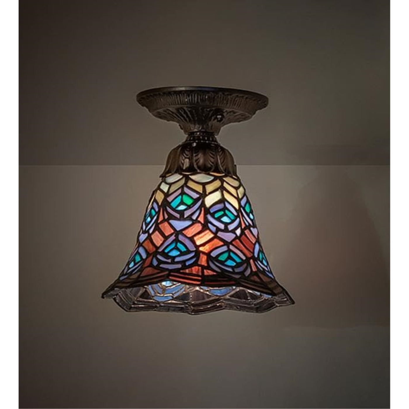This Spectacular Ceiling Fixture Features Mauve With Beige; Pink; Orange; And Gray Stained Glass That Adorn This Shade; While Feathers Feature Turquoise; Blue; And Purple. A Scalloped Purple; Blue; Orange; And Green Crest Edges The Shade Created Using The Meyda Tiffany Copperfoil Construction. Install These Stunning Fixtures To Illuminate Dining Rooms And Other Spaces In Residential; Commercial; And Hospitality Settings To Create A Dramatic Design Statement; From Davie; Florida; To Greeley; Colorado; To Vista; California. The Tiffany Peacock Feather Flushmount Is Included In Our American-Designed; Handcrafted Tiffany Reproduction Collection. The Fixture Is Ul & Cul Listed For Dry And Damp Locations. Each Shade Is A Unique Work Of Art With Color Variations Based On Natural Ingredients Inherent In The Glass.