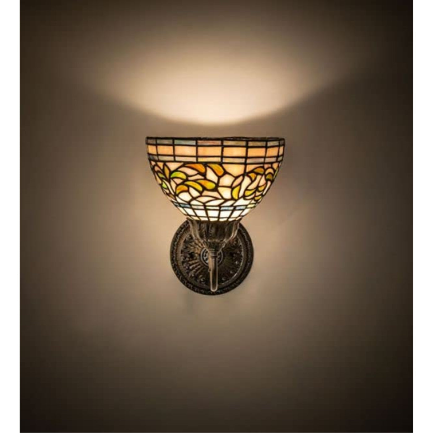 Subtle-Toned Autumn Gold; Russet; And Moss Green Leaves Swirl Against An Amber Mauve Background In This Tiffany Studio Stained Glass Reproduction. The Shade Is Enhanced With Bands Of Purple; Blue; And Green And Created Using The Famous Meyda Tiffany Copperfoil Construction Process. This Wall Sconce Is Complemented With Ornate Cast Hardware And A Mahogany Bronze Finish. This Stunning Lighting Design Is Inspired By Natural Foliage From The Bridger-Teton National Forest In Wyoming; The Beaverhead-Deerlodge National Forest In Montana; And The Salmon-Challis National Forest In Idaho. The Wall Sconce Is Perfect For Hallways And Dining Spaces In Residential And Hospitality Locations.The Tiffany Turning Leaf Wall Sconce Is Featured In Our American-Designed; Handcrafted Tiffany Reproduction Stained Glass Lighting Collection. Ul And Cul Listed For Dry And Damp Locations. Each Shade Is A Unique Work Of Art With Color Variations Based On Natural Ingredients Inherent In The Glass.