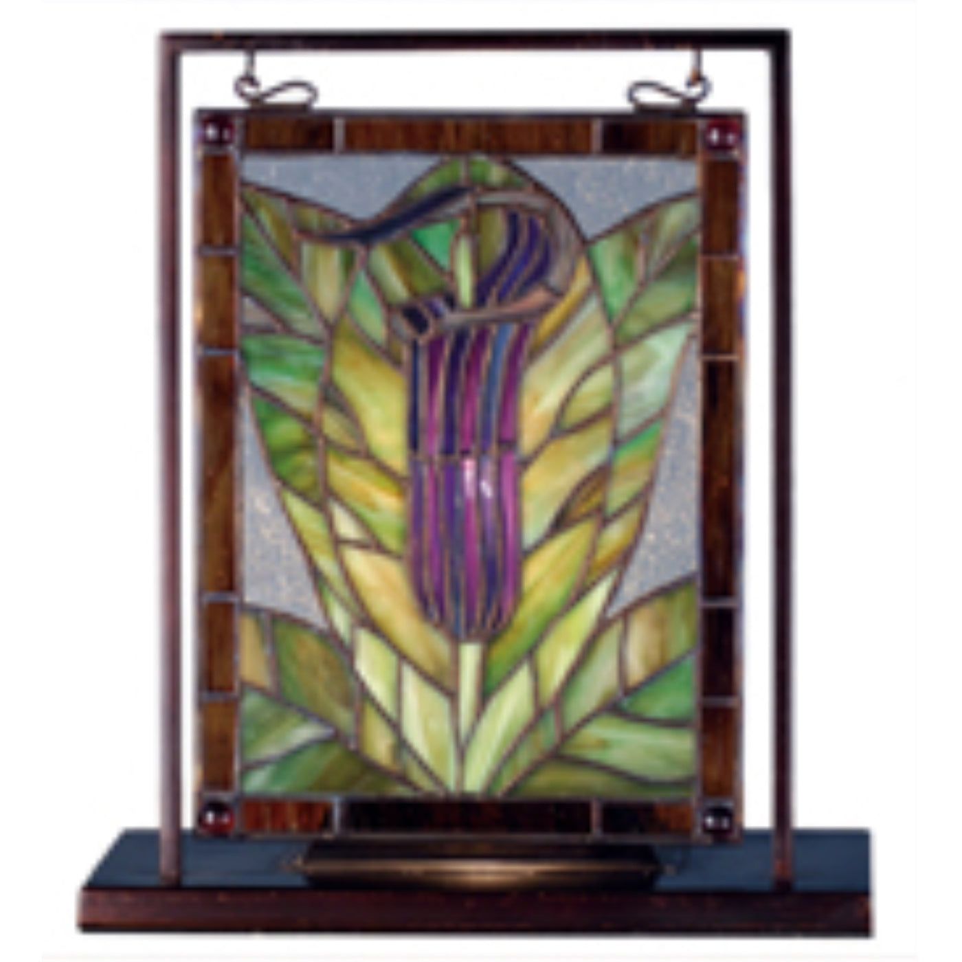68552 9.5'W X 10.5'H Jack-In-The-Pulpit Lighted Mini Tabletop Window Manufacturer By Meyda. Wandering Through The Woods You Might Happen On The Elegant Jack-In-The-Pulpit That Is Represented In Amethyst And Wood Green In This Charming Mini Window. Handcrafted Utilizing The Copperfoil Construction Process And Stained Art Glass Encased In A Solid Brass Frame; Each Window Hangs Perfectly In It'S Own Brass Tabletop Display. Lens Color : Green;Blue;Violet, Made In China