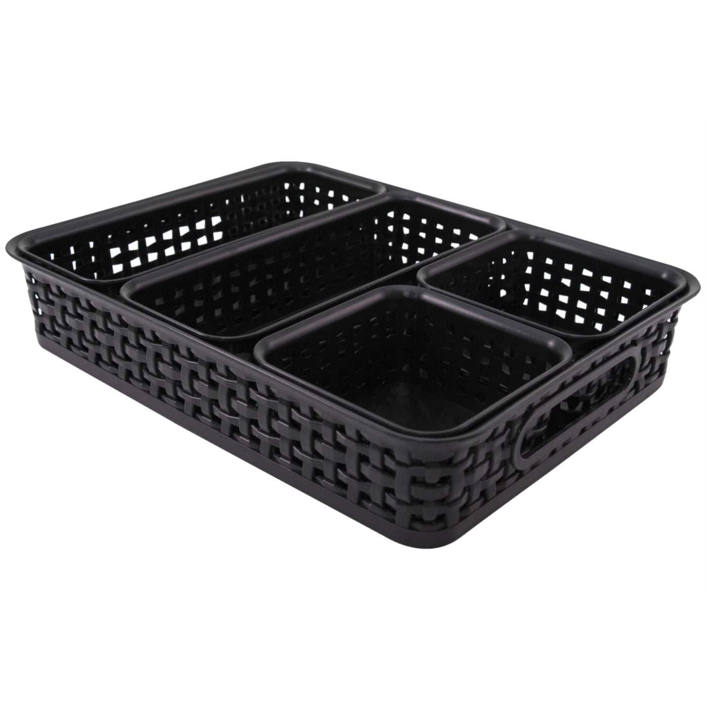 Black Woven Design Bins Comes With Two Rectangular Bins And Two Square Bins That Nest Inside A Letter-Sized Bin. The Letter-Sized Bin Is Perfect For Storing Documents While The Smaller Bins Can Store Pens, Pencils And Other Small Office Accessories. Each Rectangular Bin Measures 9-5/8 L X 4 W X 2-3/8 H Inches. Square Bins Measures 4-3/4 L X 4-3/4 W X 2-3/8 H Inches. Letter-Sized Weave Bin Measures 13-1/2 L X 10-1/10 W X 2-1/2 H Inches.