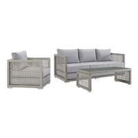 Introducing The Aura Outdoor Patio Collection, Where Casual Conversations Meet Endless Enjoyment. This Collection Features A Synthetic Gray-On-Gray Tone Wicker Rattan Weave And A Powder-Coated Aluminum Frame, Offering A Versatile Outdoor Experience. The Machine Washable And Fade Resistant All-Weather Fabric Cushions Provide Comfort And Durability. With Its Extra Wide And Deep Body, Aura Becomes The Centerpiece Of Your Outdoor Space, Perfect For Creating Cherished Memories And Hosting Lively Gatherings. The Thick Cushions And Chrome Plated Anti-Skid Feet Ensure Spacious Seating And Enhanced Comfort. This Reliable Outdoor Furniture Comes Fully Assembled And Includes The Aura Armchair, Aura Coffee Table, And Aura Sofa.