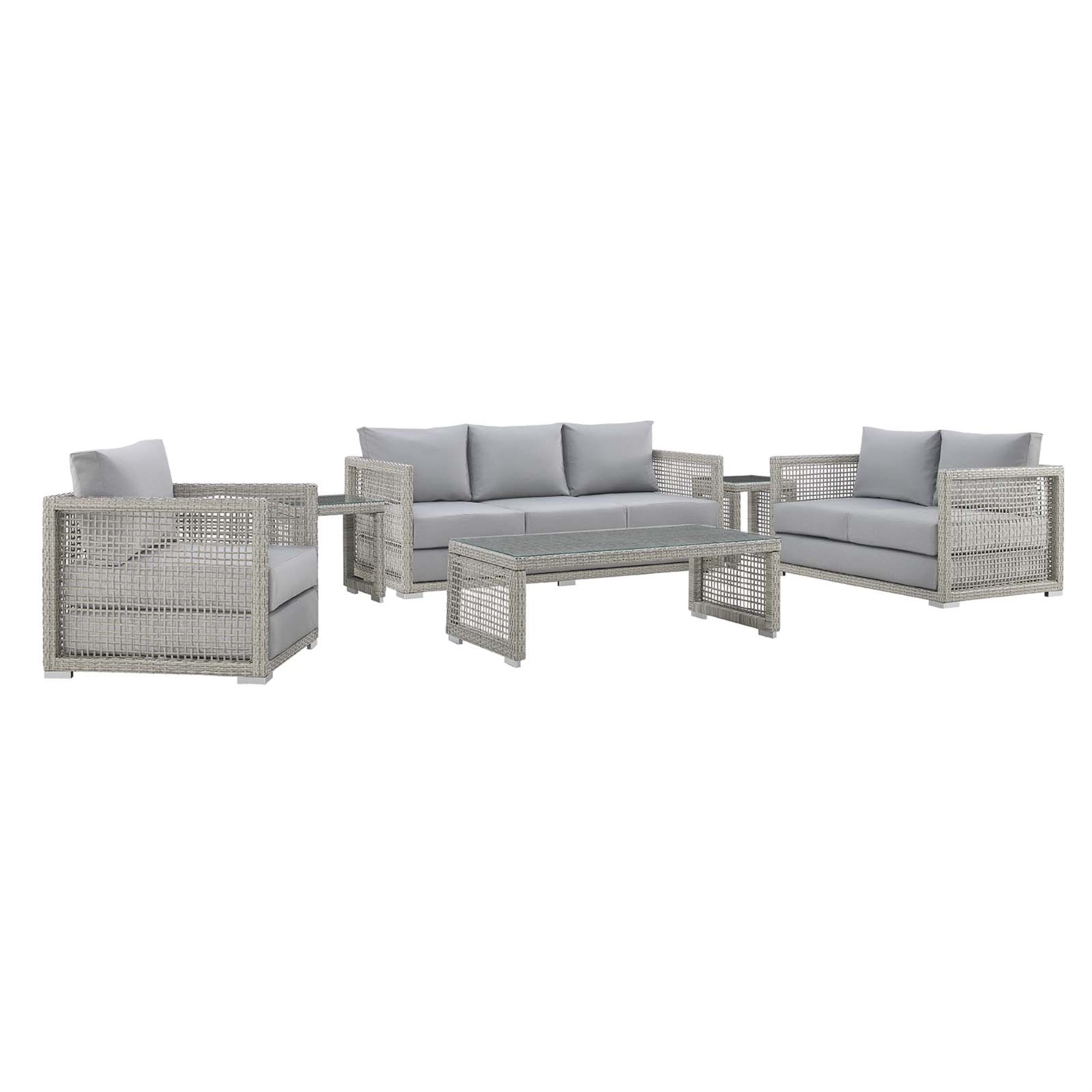Introducing The Aura Outdoor Patio Collection, A Versatile And Stylish Addition To Your Outdoor Space. Crafted With A Synthetic Gray-On-Gray Wicker Rattan Weave And A Powder-Coated Aluminum Frame, This Collection Offers Durability And Flexibility. The Machine Washable And Fade Resistant All-Weather Fabric Cushions Provide Comfort And Longevity. With Its Extra Wide And Deep Body, Aura Is Perfect For Creating Memorable Moments And Hosting Festive Gatherings. The Thick Cushions And Chrome Plated Anti-Skid Feet Ensure Enhanced Comfort And Stability. This Set Includes The Aura Armchair, Coffee Table, Loveseat, Sofa, And Two Side Tables. It Comes Fully Assembled For Your Convenience.