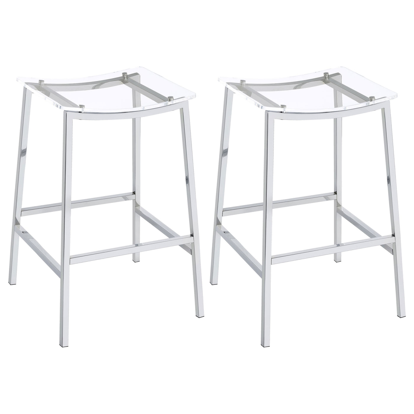 Updated To Reflect The Carefree Contemporary Style You Crave, This Set Of Two Bar Stools Uses Modern Materials And Finishes To Bring A Crisp Look. Perfect For Casual Seating At A Bar Table Or Counter, These Stools Are Lightweight Yet Sturdy. Gleaming Chrome Finish Metal Framing Includes A Two-Bar Seat Support And Built-In Footrests. A Gently Curved Seat Made Of Acrylic Reveals The Nuts And Bolts Of Metal Framing. Add This Bar Stool Set To Your Easy-Living Space For Entertaining And Family Meals.