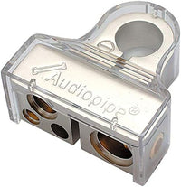 Negative Multi-Feed Battery Terminals. Platinum Plated Machined Solid Brass. (1) 0Ga. Output (1) 2Ga. Output (2) 8Ga. Outputs.