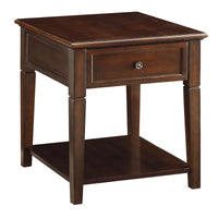 This Traditional-Style End Table Has A Warm Finish Accented By Antique Brass Pulls, Making It The Perfect Complement To Todays Upholstery Styles Constructed Of Hardwood Solids With Veneers And Walnut Brown Finish, This End Table Features Spacious Top And Tapered Legs One Drawer Offers Storage For Remote Controls, A Deck Of Cards, And Other Small Items, While The Lower Shelf Provides Further Display And Storage Space Add This End Table Next To Your Sofa To Create A Striking Look And Provide You With A Spot To Hold Your Drink, Book Or Remote Control