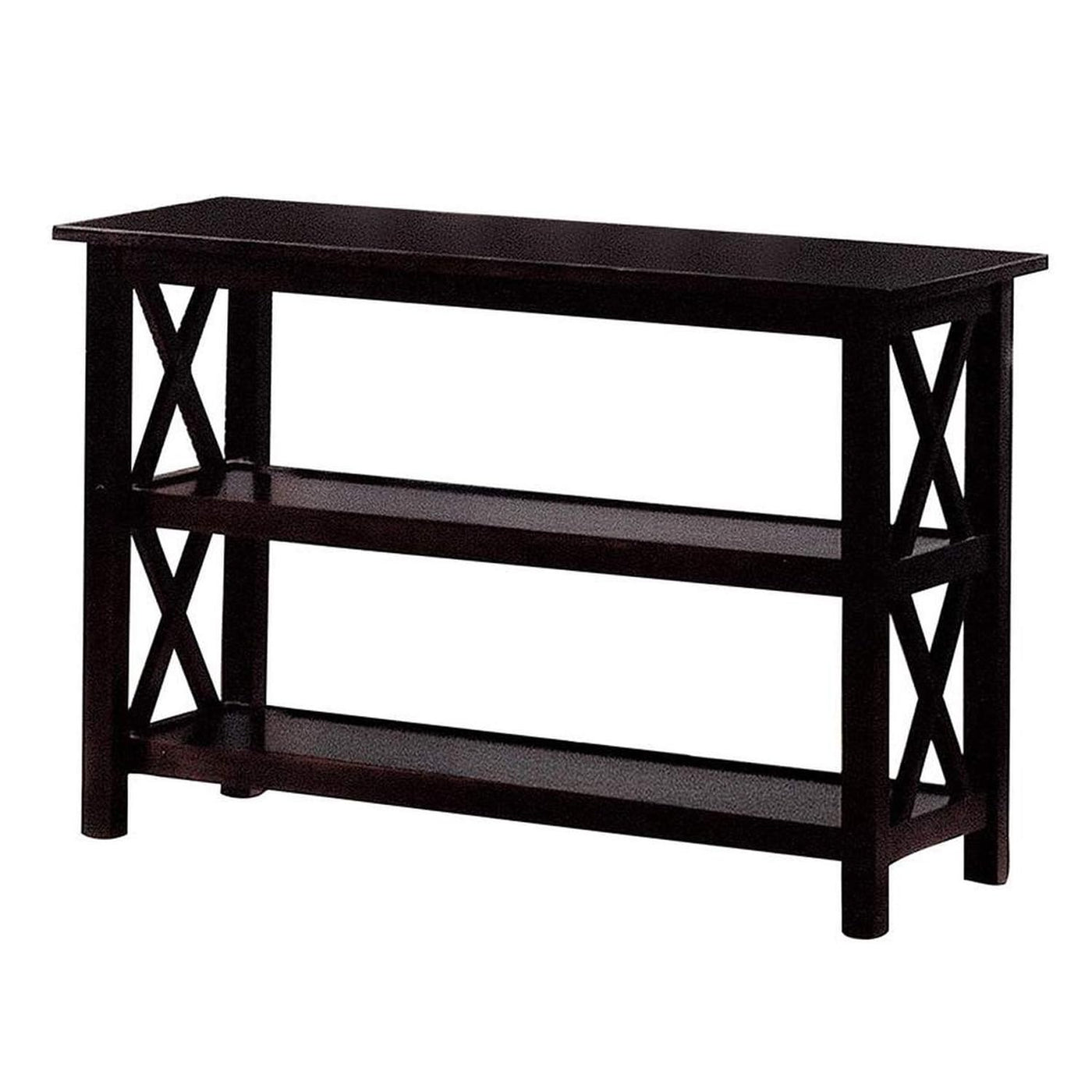 Descriptionthis Transitional Style Sofa Table Is A Welcoming Addition For Your Contemporary House Hold Made Of Wood, The Table Carries A Very Attractive Dark Merlot Brown Finish With Clean Lines The Table Features Trendy X Pattern On The Sides Which Delivers A Modish Accent Along With Two Shelves That Offers Additional Space For Display, Books And Favorite Decorative