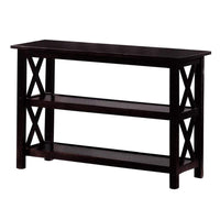 Benzara Transitional Wooden Sofa Table With X Side Design & Two Shelves, Dark Brown