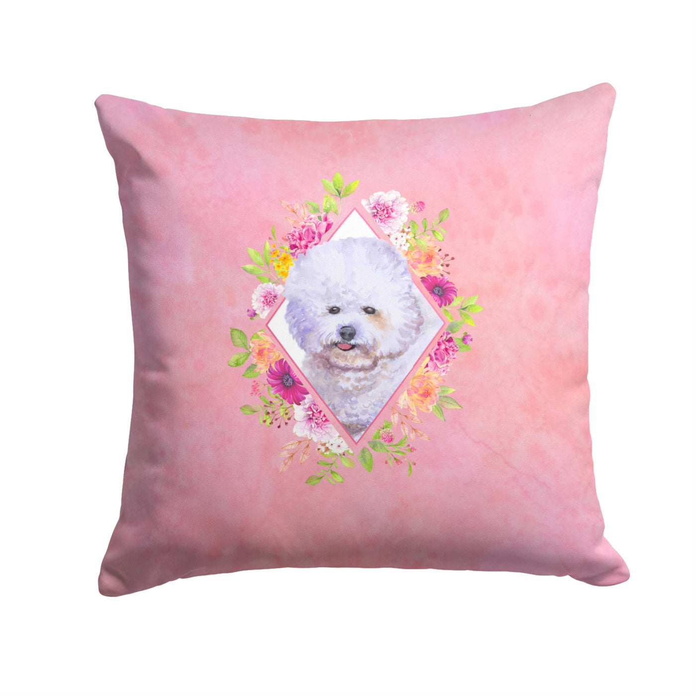 213-194030080818 Bichon Fris #2 Pink Flowers Fabric Decorative Pillow By Carolines Treasures, Inc, Made In Usa.Add Color To Your Solid Color Outdoor Patio Furniture Or Outdoor Seating Area With Our Full Color Artwork Outdoor Pillows. Approximately 14 Inches By 14 Inches Measured From Corner Of Pillow. 100% Polyester Fabric Pillow Sham With Pillow Form. This Pillow Is Made From Caroline'S Treasures New Material That Is Woven To Be Water Resistant. This Soft Canvas Fabric Can Be Used Inside On The Couch Or Outside On The Patio, Porch Or Veranda. We Dye The Fabric With Dyes That Are Color Fast And Built To Handle Weather. The Fabric Is Also Mildew Resistant, Stain Resistant, Fade Resistant And Machine Washable. Three Pieces Of Fabric Are Sewn Together To Create A Sham And Then A Polyester Insert Is Placed Inside The Sham To Form The Pillow. The Pillow Is Overstuffed And Holds It'S Shape. Both The Sham And The Pillow Insert Are Made In The United States. The Pillows Are All Handmade And May Vary Slightly In Size.