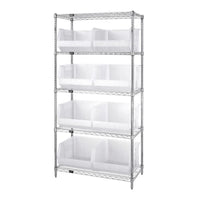 Bin Wire Shelving System, 42L X 18W X 74H, 800 Lbs Capacity Per Shelf, Includes: (5) Shelves And (8) Qus270 Clear Bins, Chrome P