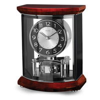 B1718 Gentrysolid Hardwood Top And Base, High-Gloss Piano Finish Over Mahogany Stain. Matte Black Sides. Polished Chrome Inlaid Accents, Bun Feet And Revolving Pendulum. Spun Aluminumdial With Raised Chrome Finish Numerals On Black Chapter Ring. Removable Clear Acrylic Back Panel. Protective Curved Glass Lens. 3.75' X .75' Engraving Plate Included. Requires (2) Aa Batteries, Not Included. H: 10.5' W: 8.25' D: 5.25', H: 27Cm W: 21Cm D: 13Cm