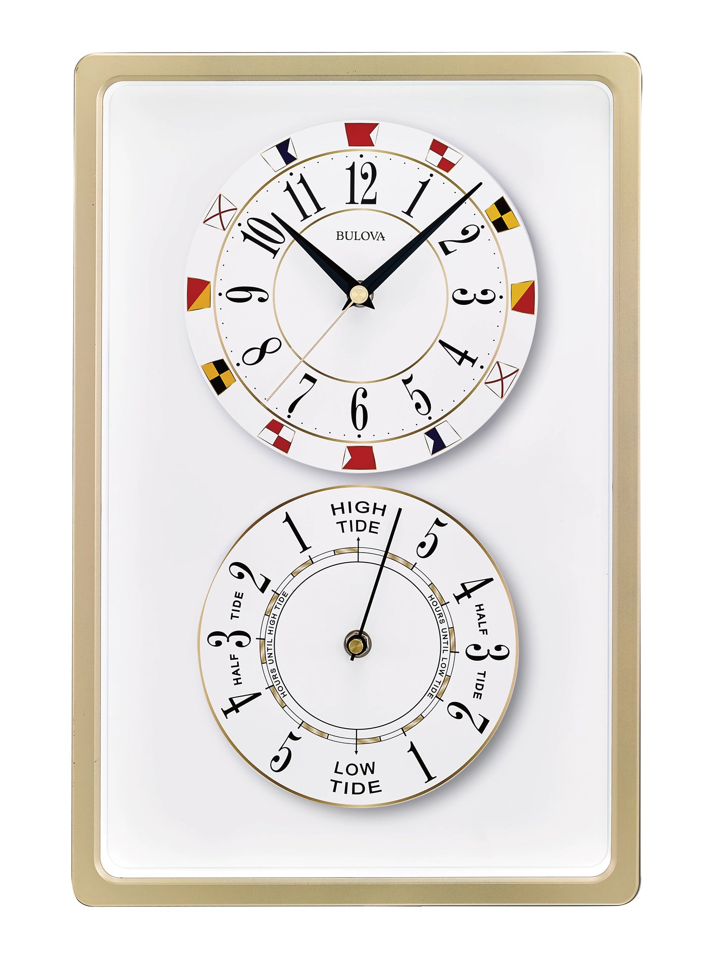 Bulova Clocks C4890 Regatta Thin Line Molded Case With Matte Gold Finish, Nautical Flag Dial And Silent Sweep Seconds Hand (No Ticking) Accent The Clock. Below Is A Tide Gauge That Tracks The High And Low Tides For The Atlantic Ocean. Great For Sailors And Landlubbers Alike. Clock And Tide Gauge Both Use (1) Aa Battery, Not Included.