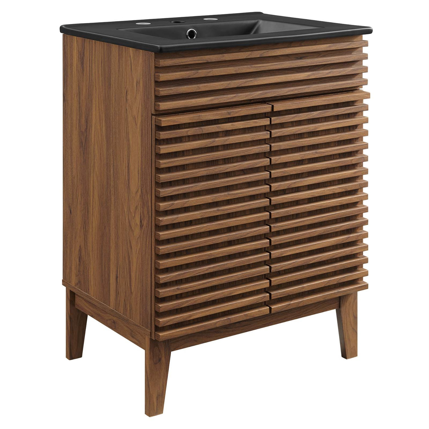 Introducing The Vanity, A Flawless Combination Of Mid-Century Charm And Practicality. Meticulously Constructed With A Sturdy Particleboard Frame And Sleek Laminate, This Bathroom Vanity Features Four Elegantly Tapered Wood Legs And Two Soft-Close Hinged Doors, Complete With An Adjustable Storage Shelf. The Sleek Design Is Further Enhanced By A Gracefully Curved Ceramic Basin And Integrated Countertop, Boasting Three Faucet Holes. Designed To Cater To Your Requirements, This Mid-Century Modern Vanity Offers Both Durability And Aesthetic Appeal. It Includes A 24' Ceramic Basin Top And Requires Assembly. Kindly Note That Fixtures Are Not Included.