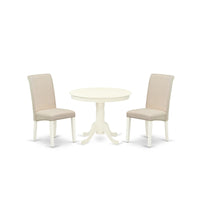 Anba3-Lwh-01 Anba3-Lwh-01 3Pc Dinette Set Includes A Small Rounded Kitchen Table And Two Parson Chairs With Cream Fabric, Linen White Finish, Dcor Your Dining Room With This Stylish Anba3-Lwh-01 Dining Set Includes A Small Dining Table And Two Parson Chairs. A Cozy And Luxurious Linen White Color Offers Any Dining-Room A Relaxing And Friendly Feel With The Small Kitchen Table. The Round Shape Table Features A Pedestal Base That Will Furnish Your Dining Area With A Sophisticated Look. With A Soft Rounded Bevel At The Edge Of The Table Top, This Well-Designed And Comfortable Kitchen Dinette Table May Be Used For Hours At A Time. This Small Dining Table Requires A Very Little Space And Itd Be A Great Choice If You Are Struggling With Space In Your Dining Area. Made Up Of Rubber Wood, The Table Is Stable And Offers A Sturdy Finish. You Need A Stylish And Affordable Dining Chair To Match Your Dining Table. The Barry Upholstered Dining Chair Is A Tasteful, Well-Made Seating Solution. It Features A Beautiful Stitched Exterior. Tall Back, Upholstery, Rolled Back, High-Density Foam Padding, Solid Hardwood Frame Construction, And Linen Upholstery Make Them Comfortable, Durable And Attractive. Whether You Use This Chair In Your Dining Room, Kitchen, Office Or Basement, It Is An Easy To Assemble And Stylish Answer To Your Seating Needs. The Standard Shape, Size And Design Makes The Dining Area Significantly Attractive. This Contemporary, Budget Friendly, Durable And Comfortable Dining Set Can Be Good Choice If You Are Looking For A Great Dining Time Experience With Your Family Or Friends.Table Specifications:Material: Asian Hardwoodcolor: Linen Whitedimensions: Length 36; Width 36; Height 29. 5Weight Capacity: 300 Lbschair Specifications:Frame Material: Asian Hardwoodfabric: Linen Fabriccushion Material: Foamfabric Color: Creamleg Color: Linen White Dimensions: Length 25. 5; Width 19; Height 42Weight Capacity: 300 Lbsincludes:1 X Round Table2 X Parson Chairn. B. : Hardware Package And Instruction Manual Is Located In/Under The Seat.