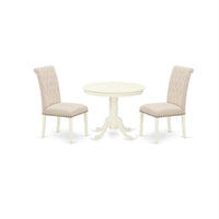 Casafoyer Anbr3-Lwh-02 Antique 3 Piece Set Contains A Round Dining Room Table With Pedestal And 2 Light Beige Linen Fabric Upholstered Chairs, 36X36 Inch