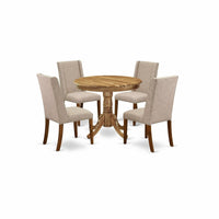 Anfl5-Ana-04 East West Furniture Anfl5-Ana-04 5-Pc Wooden Dining Table Set Included A Round Dinner Table & 4 Dining Room Chairs, Clay Linen Fabric Padded Parson Chairs Seat With Rubber Wood Legs, Natural Finish, East West Furniture 5-Piece Kitchen Dining Table Set Including 4 Kitchen Chairs And A Luxurious Pedestal Dining Table Will Enhance The Charm Of Your Dining Area Or Kitchen Areas. Our Dinette Table Set Is Crafted From Strong Asian Wood, Known As Rubber Wood, Which Is Rugged Enough To Withstand Years Of Use. It Also Has An Ergonomic Design, Which Is Very Comfortable. Single Breakfast Table With 4 Kitchen Parson Chairs Is In Natural Finish. This Dining Set Would Add Elegance And Attractiveness To Your Kitchen Area Or Dining Area. This Dinner Table Is Flexible And Cozy. This Kitchen Table Features A Compact Design Ideal For Small Spaces. The Kitchen Chair Seat Is Crafted From Soft Linen Fabric Cushion, With Solid Rubber Wood Legs And Stylish Soft Linen Fabric Backrest With Asian Wood Frame, Soft Cushion And Stylish Backrest Design To Make You More Comfortable. Our Dinette Table Set Adds Some Modern Beauty To Your Home. Kitchen Chairs And A Dinner Table Offer Lots Of Space For Your Family Or Friends. The Simplistic And Classy Design, Accentuated By A Glossy Natural Finish. You Will Certainly Enjoy This Attractive Round Kitchen Table Set. It'S Easy To Put Together The Parsons Dining Room Chairs And Kitchen Table With A Simple Tool. No Additional Tools Are Required. Easy-To-Follow Guidelines, Tools, And Hardware Are Included. With The Help Of A Damp Cloth, You Will Clean Up Your Dusty Easily. Buy Our Products In Full Confidence, Because Your Satisfaction Is Our #1 Priority. Feel Free To Contact Us, We Are Always Here For You.Features:Linen Fabric Dining Chairs Seat Color: Claypadded Parson Chairs Leg Color: Antique Walnutparson Chairs Sizes: Length 19.25; Width 25; Height 40.5Dinner Table Color: Naturaldining Room Table Sizes: Length 36; Width 36; Height 29.5Included: A Lovely Dinner Table And 4 Wonderful Upholstered Dining Chairs.
